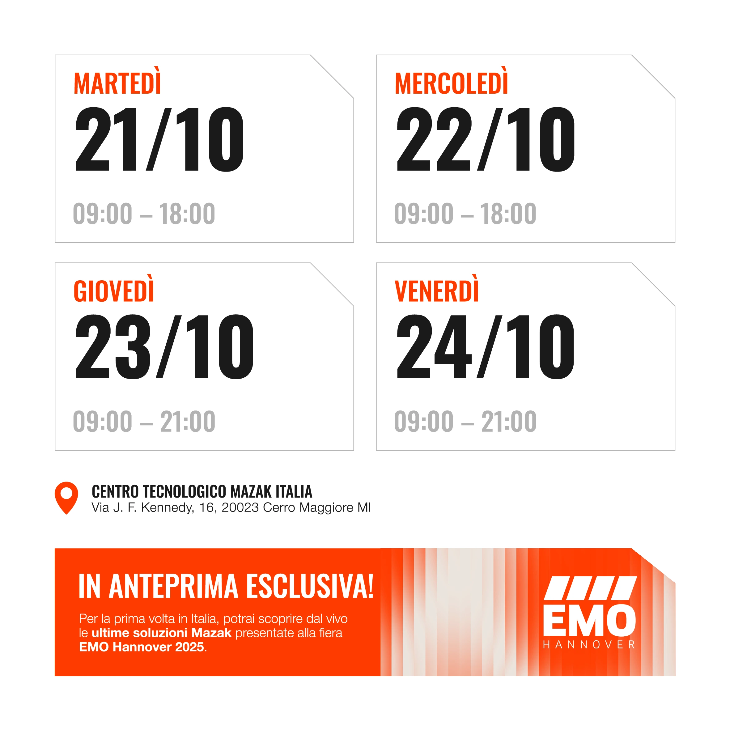 • Scoprire in anteprima le ultime innovazioni Mazak in termini di macchine utensili, automazione e digitalizzazione dei processi